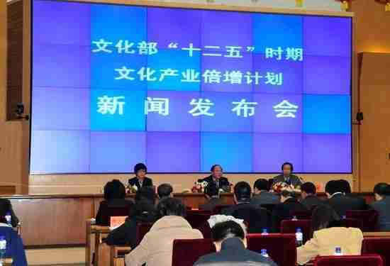 2月28日下午,,,文化部在京召开新闻发布会,,,,正式向社会发布《文化部“十二五”时期文化产业倍增计划》,,提出了 “十二五”期间文化部门管理的文化产业增加值年平均现价增长速度高于20%,,,,2015年比2010年至少翻一番,,,,实现倍增的奋斗目标。。。。